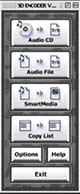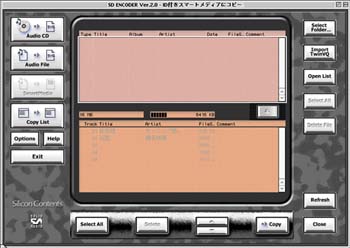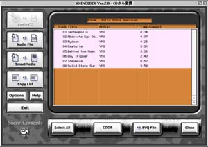 | 「SmartMedia」を押すと、SVQファイルと、手持ちのTwinVQ、MP3ファイルをID付スマー トメディアに記録できる。 | 「Copy List」を押すと、ID付スマートメディアにコピーする曲の候補リストを創ることができる。 |