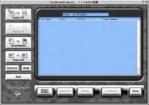 | 「SD ENCORDER」のメインメニューから「AudioCD」をクリック。CDの曲をSVQファイ ルへ変換し、ハードディスクに保存できる。 | 「Audio File」を押すと、手持ちのAIFFファイルをSVQファイルに変換、ハードディ スクに保存することができる。 |