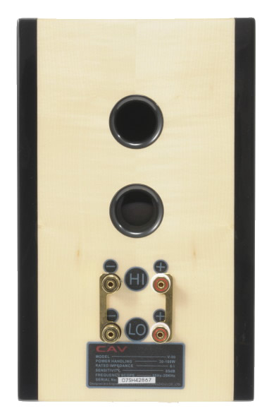 V-50BRはシリーズのベーシックモデル。その構成は、グラスファイバー材のコーンによる130mmウーファー、ピュアシルク材のダイアフラムによる25mmソフトドームの2ウェイシステムである。クロスオーバー周波数は2.5KHzで、コンパクトなエンクロージャーは全面仕上げで、リアバスレフ方式。このクラスとしては異例の大型ターミナルによるバイワイヤリング構成の入力端子は、バナナプラグにも対応している。出力音圧レベルは88dB/W/mと標準的で、アンプからみた駆動条件も良好な特性である。