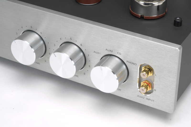 十分な厚みを確保したアルミニウムのフロントにはパワースイッチ、3極管と5極管接続のセレクター、2個のボリューム、入力セレクターと1系統のライン系入力端子が並んでいる。ボリュームノブを2個備えているのはチャンネル・セパレーションを確保するためで、音質重視の観点から敢えて操作性の面で不利になる左右独立構成としているのである。