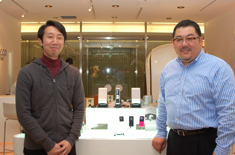 | (株)ケンウッド ホームエレクトロニクス事業統括部 企画技術部 商品企画グループ長 小川靖徳氏(左)と筆者(右)。インタビューはケンウッドのショールーム「ケンウッド スクエア・丸の内」にて行われた。 |