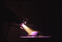 B4ピュアボロンは12000°Cを超えるプラズマの炎のなかでパウダー状B4C素材を型に吹き付け容射する。したがって無人室での作業となる。これを使って成形されたミッドレンジ用の振動板はわずか1g、驚くべき軽さである |