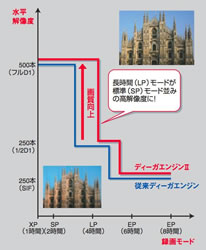 さて、LPモードの画質改善内容は多岐にわたるが、一番わかりやすいのは水平解像度の話だろう。従来、LPの画質がSPに比べて劣っていたのは、水平解像度が半減していたことが最大の理由であった。情報量を抑えて記録容量を節約するために、フルD1と呼ばれる720×480ではなく、352×480のハーフD1の使用を余儀なくされていた。2時間のSPモードでは収まりきらなかった映画はもちろん、連続ドラマなどをまとめて1枚にダビングする際にも、この制約がネックになっていた。