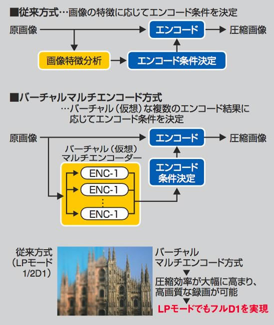 二世代目のディーガエンジンの大きな特徴は、記録効率と画質を両立させたことにある。なかでも、LPモード時の解像度を従来のハーフD1(水平解像度250本相当)からフルD1(同500本相当)に引き上げたメリットは、きわめて大きい。圧縮方法を最適化して必要な情報を確保するバーチャルマルチエンコード方式の採用など、意欲的な手法の導入が功を奏している。 |