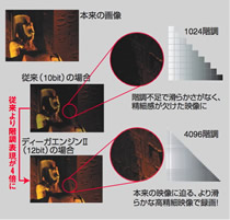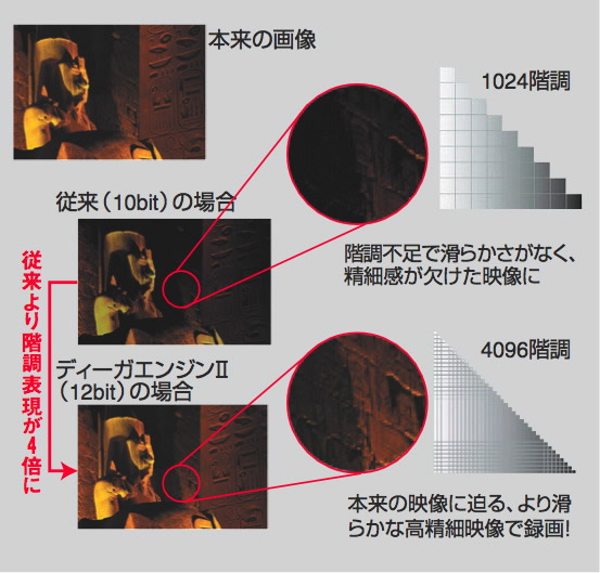 長時間モードの高画質化と並ぶ重要な画質改善が、入力信号の高品位化である。12bit動作の新しいA/Dコンバーターは、10bit動作の従来型に比べて4倍なめらかな4096階調を表現できるため、明暗差の忠実な再現に有利にはたらく。入力信号の質感が上がると、デジタル圧縮後の画質は確実に向上するので、大きな効果が期待できるのだ。特に大きな画面で威力を発揮する。 |