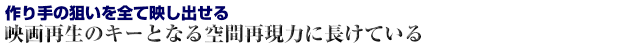 林 D-ILAは業務用のILAがベースになっていますね。 大橋 つまり、家庭用テレビの画をいったん解体し、プロシューマー分野で新たな大画面世界の創造に取り組んできた成果が今現れているということだと思います。 林 なんといっても一昨年のDLA-HD1の成功が大きかったですね。ネイティブコントラストという潔い新概念を打ち出し、未知の映像世界を切り開いたわけですから。絞りをいじらずに黒と白のレンジを幅広く確保したのは衝撃的でしたね。 大橋 D-ILAデバイスの使いこなしが確立されたのはさらに一世代前のDLA-HD11だと思います。HD1の意義は、そのノウハウを家庭用製品として通用する値付けができたことにあります。 林 高クオリティでありながら、100万円を大幅に切る価格を実現したのはインパクトがありました。 大橋 ええ。 林 ビクターの場合は、ILAの時代から400インチを越えるようなサイズでの投影実証に取り組んできました。それを100インチクラスの家庭用製品に高クオリティに落とし込むのは容易だったはずです。 大橋 HD1以降3世代目となる本機の画を観ると、ビクターがさらに次ステージを見据えていることが感じられます。