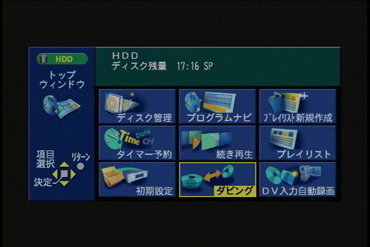 本機は、録画中の番組を再生する「追っかけ再生」や、録画中、HDDに記録済みの他の番組を再生する「同時録画再生」など、HDDの高速転送レートを生かした機能をフルに搭載。内蔵するハードディスクの容量は40GB、記録時間は録画モードに応じて8.5時間から52時間まで、たっぷり余裕がある。DVD−RAM両面ディスクのEPモードまで動員すれば、メディアを交換せずに最長58時間の録画ができることになる。これだけの容量を生かすために、本機のタイマー予約は32プログラムまで対応する。