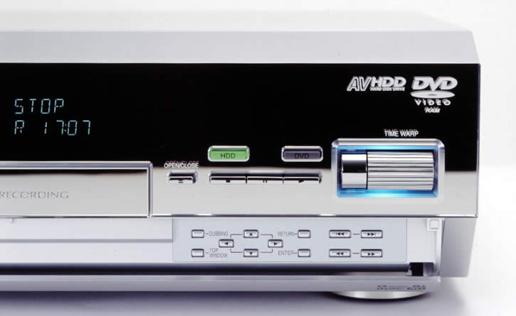 番組サーチに便利なタイムワープローラーは、RAM、HDDいずれのメディアに記録した番組の再生中にも利用できる。長い番組の後半辺りに見たいシーンがある場合など、通常の早送り機能でサーチするとかなり時間がかかるが、タイムワープローラーをくるくると回せば、最長360分(HDDは999分まで)まで1分単位で位置を指定し、瞬時に頭出しができる。この操作感は実に快適だ。なお、このローラー部分の青い照明は、本体ディスプレイのディマー機能をオンにすることで点灯しないように設定することもできる。 |