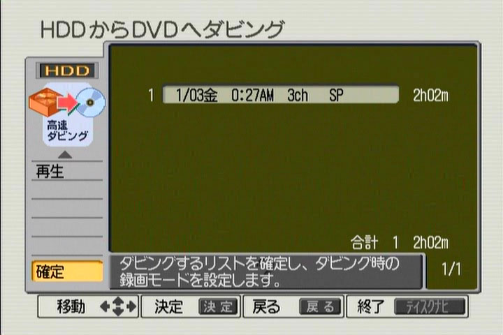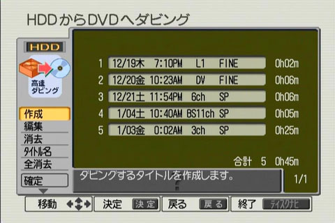 「ダビングリスト」に複数のタイトルを「作成」することもできる。各タイトルは、ダビング時に一括ダビングされる。リストにダビング済みのタイトルを残しておくと一括ダビングされてしまうので、不要なタイトルは消去する