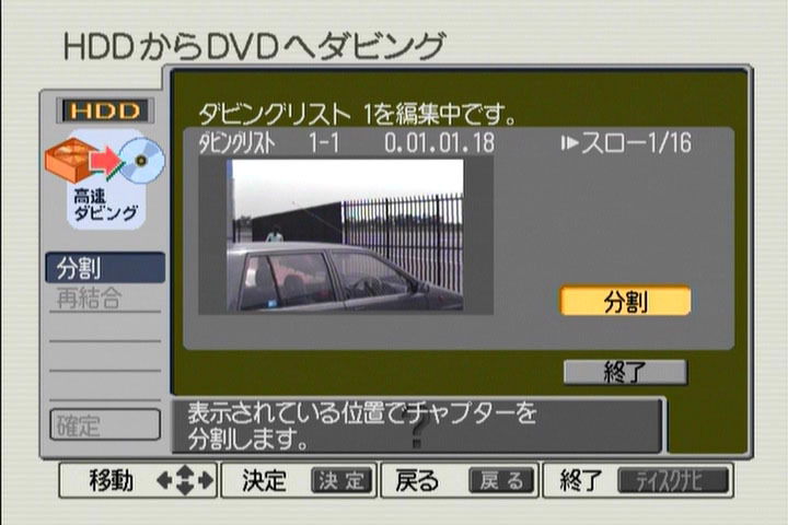 リモコン操作でシーンを探し、CMの前後などでシーンを分割する。この作業を繰り返し行うことで、複数のシーンに分割できる。分割されたシーンがチャプターになる。