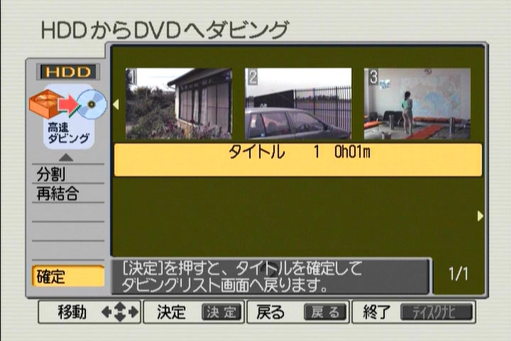 上図のようにチャプターが消去された。消去作業を繰り返し、不要なチャプターを消去し終えたらタイトルを「確定」。このタイトルをDVDにダビングすれば編集が完了する。以上は仮想タイトルでの編集になるので、HDDの録画データは削除&改変されない。なお、編集情報の恒久保存はできない
