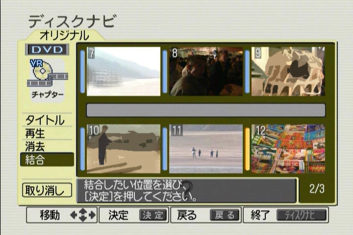 | DVD-RW(VRモード)の「ディスクナビ」のチャプター編集画面。DVD-RW上の編集は比較的自由度が高く、DVD上の録画タイトルを直接編集でき、チャプターの消去、結合などが可能。結合はチャプター間にマークが出て判りやすい |
