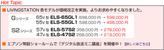 また価格についてとびきりのニュースがある。65GL1が59.8万円、また55GL1については49.8万円と、いずれも10万円の大幅ダウンが計られているのだ。発売時期は当初の予定より遅くなったものの、さらに入念に画質、音質が仕上げられており、エプソンのこの英断には拍手喝采。またこの8月からは、スタンダードタイプのS2シリーズについても価格改正が行われ、より低価格でハイビジョンの迫力ある映像を楽しめるようになった。ぜひ常設ショールームなどにも足を運んで、その映像美を確認して欲しいものだ。 |