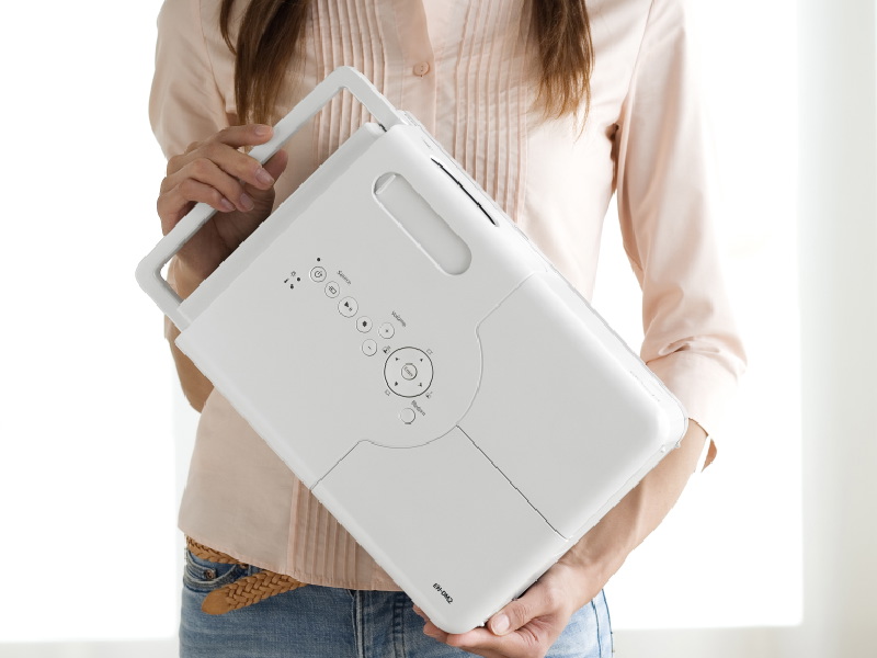 DVDの映像をチェックしてみよう。これだけコンパクトな筐体から、DVD映像を大画面で投写できるのは感動的だ。本体に内蔵するスピーカーは、小型だけあって大音響とまではいかないものの、”Dolby Virtual Speaker”技術による立体感のあるサウンドは秀逸だ。EH-DM2で映画を視聴する際は、少し暗めの部屋では映像モードを”リビング”、真っ暗な部屋で視聴する際は”シアター”モードを選びたい。明るい部屋向けの”ダイナミック”や”リビング”設定を使用する際には、個別の調整機能で色の濃さを下げれば、映画のフィルムらしい質感に近づけられる。 映画の鑑賞を終えたら、上部のレンズカバーを閉じてスクリーンを巻き取り、棚などのスペースにコンパクトに収納できる。本体にはハンドル以外にも、収納や持ち運びに便利なソフトケースも付属するため、例えば自宅のリビングだけでなく、子供部屋や寝室でも使えるよう家族で共有できる。もちろん、近所の友人宅に持ち込んで一緒に鑑賞することも可能。ワンボディ+スクリーンという従来の常識を覆すスタイルの本機は、映画を架け橋としてコミュニケーションを広げてくれる。
