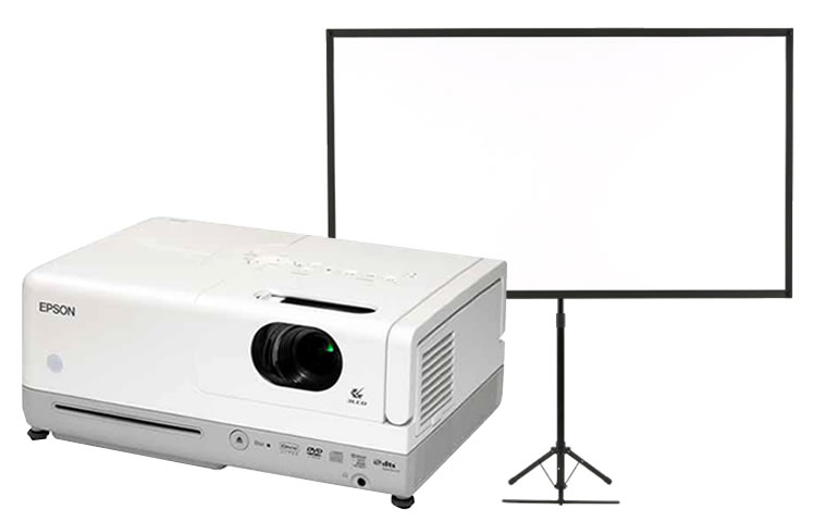 通常、ホームシアターを実現するためには、映像を投射するプロジェクター、DVDやBDを再生するプレーヤー/レコーダー、音を再生するアンプ、別売りのスピーカー、映像を投写するスクリーンと、5種類の製品を揃える必要がある。EH-DMS2はこのうち、プロジェクター、DVDプレーヤー、アンプ、スピーカー機能に加え、80型スクリーンも同梱しており、必要な5種類すべての機能をワンパッケージで揃えることができるのだ。
