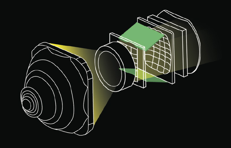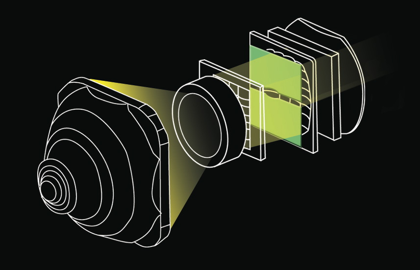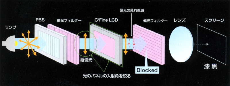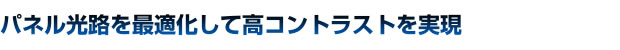 高コントラストを実現するために、今回、エプソンが新しく採用したのは、パネルの前後で行った2つの技術である。まずパネルに入る光路の最適化を行った。ランプから投射された光は、入射偏向フィルターで角度が絞られ液晶パネルに入射されるが、斜め光の割合が多いと光漏れの原因となり、結果的にコントラストが低下する。エプソンはここに着目し、斜めに入る光の角度が小さくなる(入射角を絞る)ように改善した。もう一つの技術はパネルを通過した光の楕円偏向を垂直偏向に近づけるための厳密な偏向制御である。これは、パネルと投射レンズの間にある出射偏向フィルターへ、素直に縦偏向された光を送り込む技術で、フィルターからの水平方向の光漏れを低減させている。