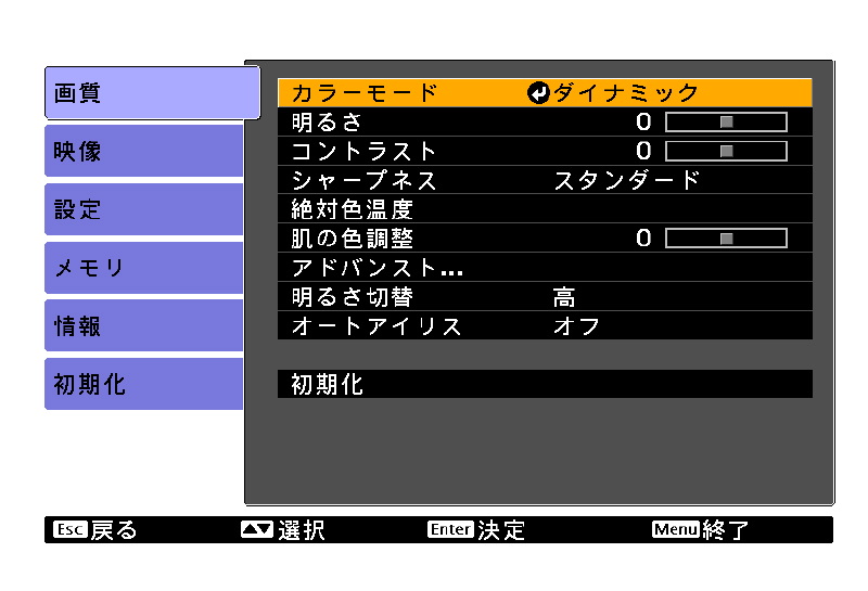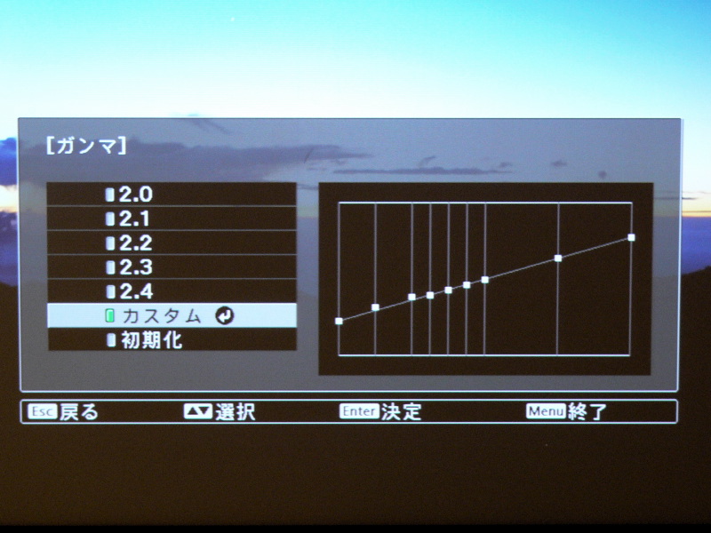 読者のために調整値を明記しておこう。モード「シアター」/明るさ±0/コントラスト−2/カラーサチュレーション−7/色あい±0/シャープネス:スタンダード/色温度7500K/スキントーン±0/ガンマ2.0/ランプパワーLowである。さらにガンマのグラフを見ながら、カーブを微調整している。 |