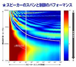 | 一般的な方式は、通常の2chステレオを踏襲したもので、全周波数域の音源がリスナーから60度に位置するために、制御効果のよいところ(青い部分)と悪いところ(赤い部分)が断続的に存在することになる。OPSODISでは3本のスピーカーのユニットを左右対称、水平方向に並べて設置する。こうして再生周波数が下がるに従ってスピーカーユニットを最適な角度で広げることで、どの周波数域でも高い制御効果が得られるという仕組みだ。そのためにOPSODISでは各スピーカーの設置位置と振り角が厳格に決められている。 |