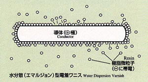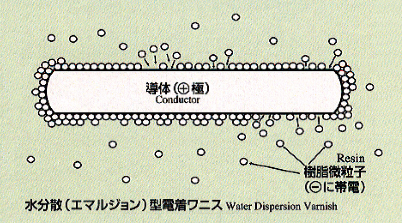 Electro-Deposition Insulating System)電着絶縁で製造される。エポキシ変性アクリル樹脂を絶縁に使用した、いわば樹脂の電気メッキと言える方法で、樹脂粒子は絶縁の薄い部分を探すように付き回るので非常に均一な絶縁が得られる。また、コーナー部には電界集中が起こり、周囲より厚く絶縁されるため、均一性・耐電圧性などの絶縁性能が非常に優れる |