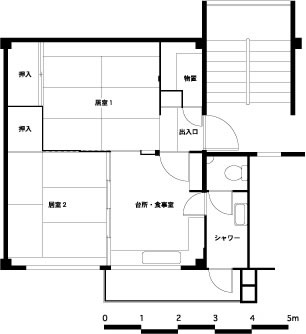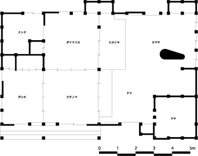 | 日本古来の農家の典型的な間取り。個室がなく廊下という概念もない。もちろんリビング的な考え方も存在しない。 |