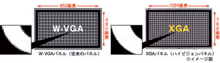 XGAというのは1024×768画素で構成され、すなわちハイビジョンに対応したパネルである。従来の地上波レベルのパネルでは853×480画素だったから、どれだけ精細になったか数字の上でも明らかであろう。