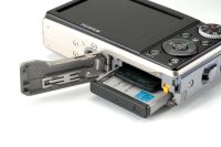 | メモリーカードは小さく薄いxDピクチャーカード(SDカードも可)を使用、電池は専用のものだが、これもCFカードを2枚重ねた程度の大きさである。携帯性の良い充電器も付属するので旅行でも安心だろう。