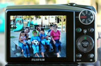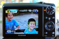被写体の顔を認識するカメラは最近のトレンドになっているが、実際にこの機能を使ったのは今回が初めてである。F50fdは、従来からの「顔キレイナビ」をさらに進化させ、斜め横向きの顔でも認識するようになったという。被写体にカメラを向けると、液晶画面に表示された人物の顔の周囲に緑や白の枠が現れる。最大10名の顔を検出し、最適な画質に写るようにカメラが考えてくれる。緑の枠は優先される顔の周囲に現れる。中央付近、カメラに近い顔や正面を向いた顔が優先されるようだが、私の使用状況ではどうやら男性より女性の方が良く認識されるように感じた。人物の撮影は、瞬間の表情を素早く写す必要がある上、失敗が許されず、とても緊張する場面だ。こんな状況でも神経を使わず、相手の表情にだけ集中できるのはすばらしい。早く私の仕事用カメラにも搭載してほしい機能である。動き回る顔にも追随するので、子供さんを撮るときにも便利だろう。