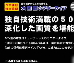 後日、この原稿を書くに当たって、富士通ゼネラルに質問したところ、PDS5003J−Hのフィルターは、従来機のものとは違うことが判った。富士通ゼネラルは、フィルターメーカーと共同して、新しいパネルのために、新規にカラーフィルターを開発していたのだ。開発のポイントはいくつかあった。まず、外光反射防止のためのコーテングを施したこと。放電の色を吸収するように設計したこと。RGBの色が、正しく出るように分光特性の調整に時間をかけたこと…。 |