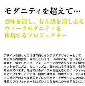 今年のミラノサローネの展覧会『HANA』もそうだったんですが、「ウィークモダニティ」が最近の僕のテーマなんです。このところずっと弱さのデザインとは何なのだろうかと考えているんですが、このプロジェクターにもそれが現れているかもしれませんね。デザインしている時は意識していませんでしたけれども(笑)。