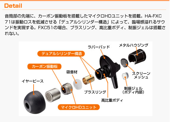 上位モデルの「HA-FXC71」と「HA-FXC51」との技術的な相違点は、筐体に用いている素材と、内部構造が大きなポイント。HA-FXC51はアルミ製ハウジングを用いているのに対して、HA-FXC71はステンレス製ハウジングに加えて、高比重素材ボディと真鍮リングによるデュアルシリンダー構造を採用している。その相乗効果により振動ロスを適正に抑制し、ユニットの真価を引き出す。