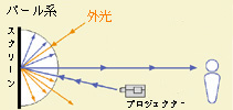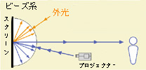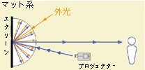 数字だけみると、歴代のホームシアター用ビーズスクリーンは、プロジェクターの光出力が増すとともにゲイン(反射利得)を序々に下げてきていることが分かる。この数字は大きい方が反射性能が高くて明るい画面が得られることを示している。 ●ゲインだけでは語れない映像の表現力 だから明るい環境下ではゲインが高い方がコントラストを確保しやすいのだが、暗い部屋で光出力が高いプロジェクターを使うと、映像の明部がまぶしいほどになり、また暗部が浮いて見えて自然画の観賞には支障も出てくるのである。つまり、強力なプロジェクターを使い、暗い環境下で映像を観賞しようという場合、ゲインが低い方が有利になってきたのだ。 しかしピークゲイン1.6というと、マットタイプである「マリブ」の1.4とくらべて、まだ明るいように見える。しかし、「シアターグレイ」はまぎれもなく映像観賞用なのであり、特に液晶プロジェクターから強靭なコントラストの映像を生み出すことを目指して開発されものだ。その実体を探ってみよう。 ●迷光対策にはビーズタイプが適している