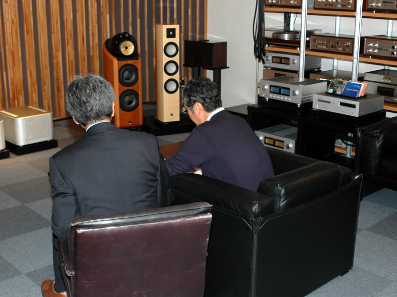 メーカーのスタッフに説明を受けながら試聴を進める石原氏 |