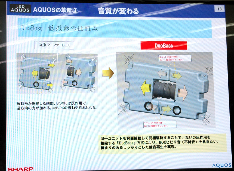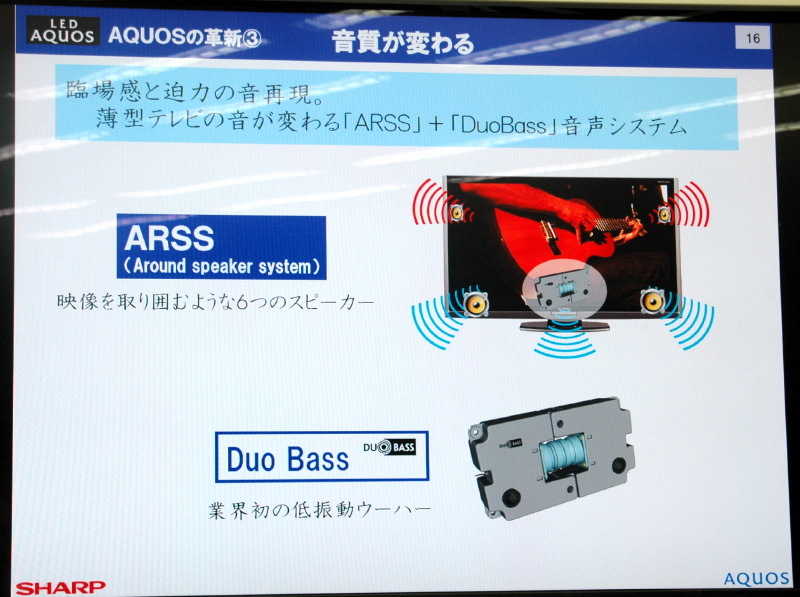 薄型テレビ時代を迎え、高精細、高画質、低消費電力と、全てが進化したかのようだが、実は、その薄さゆえに音質が犠牲になった。一般的に低音の迫力は、十分な容量と強度を持ったスピーカーボックスが必要となる。技術開発が進んだ結果、一昔前に比べれば薄型テレビの音質は随分向上したが、それ以上に薄型化するテレビのトレンドについて行けていないのが現状だ。シアターラックと呼ばれる、テレビ台の形をしたホームシアターシステムが人気だが、裏を返せばテレビの音が貧弱という証でもある。本音を言えば、テレビ本体の音質が高ければ、壁掛けでも良い音が楽しめるわけで、それに越した事は無い。
