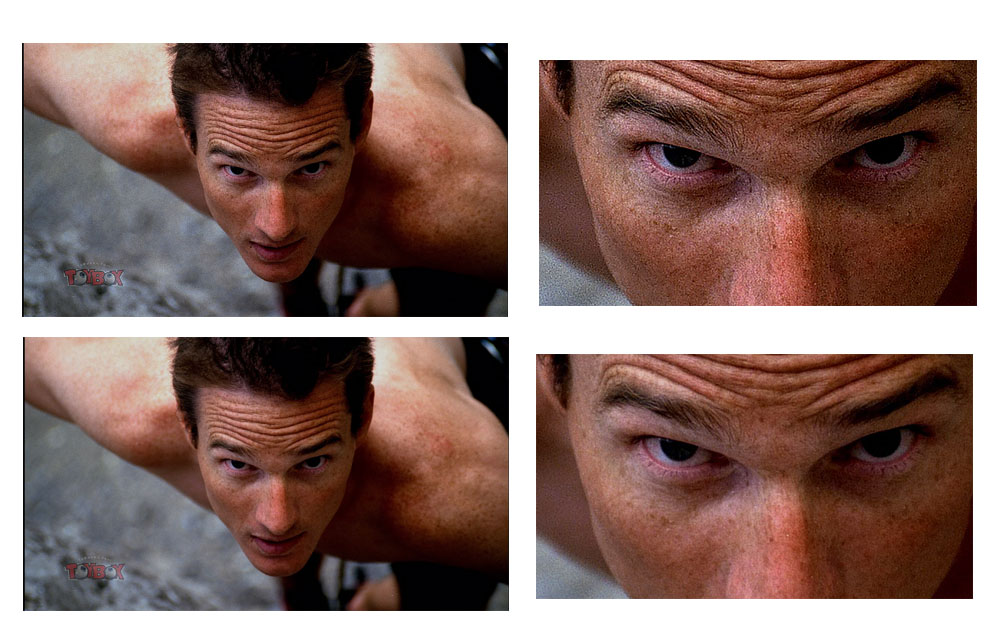 4つめに「フィデリティエンジン」と呼ばれるノイズ除去・ディテールエンハンスアルゴリズムを積んでいる。1画素単位で4-4-4処理を行うというから、まさに気が遠くなるような演算量だ。GF9350の演算速度の速さを実証する技術のひとつといってよい。シュートをつけることなくディテールの切れを改善することと、中間輝度周辺で目立ちやすいノイズを効果的に抑えることが目的で、こちらも「ファインエッジ」同様、オリジナルの映像信号に含まれる情報を犠牲にすることなく、大きな効果を発揮することが期待できる。サンプル画像を見ればその効果の大きさは一目瞭然だ。
