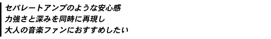 両機を組み合わせて聴くCDの再生音は、スケール感のある鳴りっぷりの良さに特徴がある。オーケストラの強奏やオルガンのフォルテシモを余裕でこなし、頭を押さえられる印象がまったくない。まるでセパレートアンプを聴いているような安心感がある。