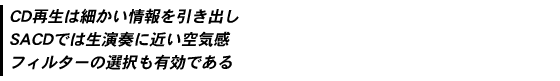 | SA-11S1の基本的な再生音もインテグレーテッドアンプのパターンに準じるが、センターメカニズム配置と筐体構成、ニュープレミアムデザインがもたらす独自の安定感が印象的。CD再生音にあっても伸びやかで高密度なフラットバランスをベースにSACDに肉薄する爽快なパターンが得られ、聴き慣れたソースの深部に埋もれていた細かい情報まで映し出す高い描写性に特徴。SACDではレンジが一段と拡大、しなやかで厚く、生演奏に通じる空気感を演出、アナログに最も近いデジタル方式というDSDの持ち味が反映される。興味深い点は、両フォーマットに対応するフィルター選択機能で、ソースに適正の選択により録音時の環境が克明に再現される。