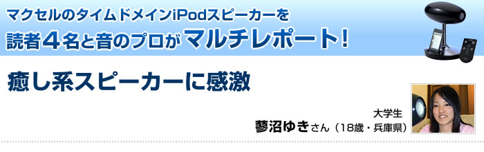 最近いろいろなiPod用のスピーカーがありますが「デザインがモダンなのでどこにでも置けるし、どこで聴いても音に偏りがない、見ても聴いても、こういうおしゃれなスピーカーはありそうでないよなあ」とは父の感想です。でもどんなスピーカーもやはり「音楽を楽しむ」って言うところが一番大切じゃないかと私は思います。機能やデザインも大事なところかもしれないけれど、私がやっとこれから一番したかったこと、聴きたかった音楽のために、こんな癒し系のスピーカーがあったんだなぁ、と本当に感激しています。