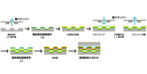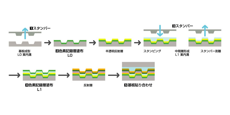 ▲一つの基板上に、2つの記録層を順に積み上げて、2層式ディスクをつくる「2P転写法」は同社製品の特長を際だたせるコア技術だ |