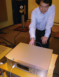 | NA7004の接続を確認する山之内氏。その完成度に、感心しきりであった。フロントパネルには、iPod/iPhoneとのデジタル接続に対応するUSB端子を装備しており、その接続法での試聴も行った |