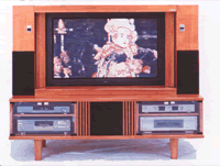 誰もがカンタンに使うことのできる“オールインワンシステム” ニチコはもともとホテルやカラオケなど、業務ジャンルでのAV機器のシステムアップが本業なので、リモコン操作などをカンタンにする技術なら、まさにおまかせというメーカーなのだ。今回発売されるヤングユーザー向けの「eカラーコレクション」シリーズにも、ニチコならではの深いノウハウが生きている。 「リビングは、いまファミリーシアターへ!」。これが、ニチコの提唱する“ライブシアター”のコンセプトだ。 家族団らんのリビング空間に、DVDプレーヤーやAVアンプ、大型ディスプレイに5.1チャンネルのスピーカーセットといったAV機器を持ち込んでスマートに使いこなすのは容易じゃないが、それを「オールインワン」にして家族誰でも、それこそおじいちゃんでもおばあちゃんでもリモコン一発、テレビ感覚で楽しめる。それが人気の“ニチコ・ライブシアター”なのである。 ではどのようにシステムアップされているかというと、ご覧のようなボード一体型だ。サイドボードのような木製ラックの中に、ホームシアターに必要な機器がすべて配置、配線ずみなのだ。これは42型のプラズマディスプレイを核とした「LS−42BP」というモデルだが、プラズマの薄型大画面がすっきりと納まり、左右のメインスピーカーはもちろん、置き場所に困るセンターやサブウーファーまで、合理的かつ美しく収納されている。その下の段には話題のBSデジタルチューナーやD−VHSデッキも見える。 あなたがもしこれだけのものを、バラで購入して組もうなんて考えたら配線はゴチャゴチャ、機器の切り替えも面倒。ちょっと二の足を踏むのじゃないのだろうか。一体型ならではのスマートさと利便性がここにある! もっとビッグなサイズが欲しいというニーズにはプラズマの50型もあるし、60インチ、80インチのスクリーンまで収納したジャンボ仕様までラインナップされている。こちらは液晶プロジェクターによるフロント投射型だ。もちろんすべてBSデジタル、ハイビジョンに対応。ドルビーデジタルやDTSで、ハリウッド映画の大迫力音響も満喫させてくれる。