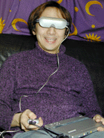 屋内の場合はふつう携帯性は求められないので、据置型プレーヤーとの接続の場合には、アイトレックに対する電源供給はコンセントからACアダプターを介して行うことになる。ACアダプター自体はコンパクトではないが、それでも、いったん接続してしまえば邪魔にはならない。アンプもテレビやスクリーンも必要ないので、ただDVDプレーヤーとEye-Trekだけあれば映画鑑賞ができてしまう。