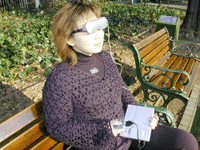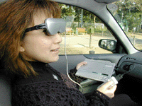 スクリーンがなくても明るいところでも大画面を楽しめるEye-Trekなら、屋外シーンで大活躍。前が見えなくなるので歩きながらというのはさすがに無理だけど、公園のベンチで、駅のベンチや通勤電車の中で(←ちょっと勇気がいるかな?)、車の助手席で、ホテルのロビーで、交差点で…人目を気にせず映画を楽しんじゃいましょう。邪魔になるものではないから満員電車の中で映画を観たっていいわけだし(←これも勇気があれば)、待ち合わせの時の暇つぶしもこれさえあればバッチリ。もし屋外などで隙間から入ってくる光が気になる場合、別売オプションのサイドバイザーというものを使えばみごとに遮光できるので、屋外にいながら映画館で観ているような臨場感を味わうことができる。車の中でもポータブルDVDと組み合わせて映画を観ることができるのだから、高速道路の退屈な時間を楽しく乗り切ろう。ただし運転してる人をあまり孤独にしないように…。