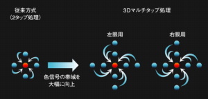 3Dで好ましい画質を得るためにはいくつかの条件が必要となります。まず今までのテレビよりももっと明るくすること。3D映像を楽しむためには専用の眼鏡を使う必要がありますが、そこで発生する光のロスを補う必要があるからです。また、3Dの再生では左眼用映像と右眼用映像を交互に高速再生しなければなりません。そこでは短い発光で充分な明るさを出す必要があるのです。