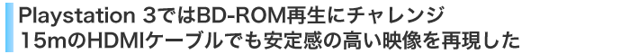 今回は『アンダーワールド2 エボリューション』、『ラヴァーズ』、『フィフス・エレメント』の3作品を視聴したが、「いずれのタイトルもこれまで何度も視聴してきたソフトだが、PureAVで観た印象は色の再現がとてもナチュラルであると感じる」と語る山之内氏。「HDMIケーブルは一般的に長尺になるほど信号伝送に不安があると言われるが、PureAVは15mのケーブルでも安定感の高い映像を楽しむことができる。S/N感も大変良い」と評価する。なお、今回のテストで使ったPlaystation 3は話題のHDMI ver.1.3の出力端子を初めて搭載したBD-ROM再生機としても注目されている。テストしたHDMIケーブルは、レギュラーの1.2m、2.4m、長尺の9.1m、15mと、いずれのモデルでもPlaystation 3からBD-ROMの1080p映像が問題なくモニターに出画されることが確認できた。 |