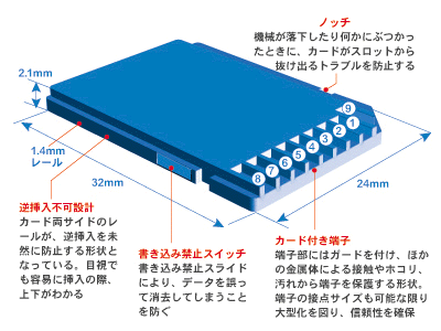 SDメモリーカードの大きさは24mm×32mmで、厚さ2.1mm。重さは約2g。非常にコンパクトな切手サイズ。MMCをちょっと厚くした感じ。9つの端子でハードウェアとデータのやりとりを行う。