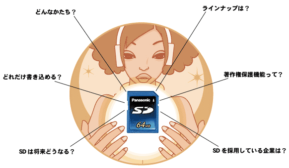 SDメモリーカードとは、何種類もあるメモリーカードの中でも、最初から著作権保護機能を付加することを前提とし、松下電器・東芝・サンディスクが共同で開発したカードだ。