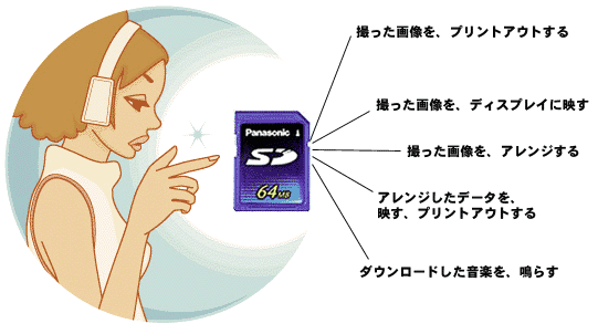 SDメモリーカードは基本的にデータの記録をするための媒体なので、 テキストでも音声でも画像でも、何でも記録・再生することができる。さらに、インターネットからダウンロードした音楽を携帯型SDオーディオプレーヤーで再生したり、SDデジカメで撮った画像をSD対応プリンタでプリントアウトしたり、SD対応携帯電話でメール送信したりなど、ただ単にデータを記録するだけでなく、異なる機器の間のデータの受け渡しをケーブル接続することなしに行うことができるのだ。
