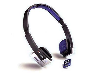 この製品はヘッドフォン自体にプレーヤーを組み込んだもので、音楽ファイルを記録しSDメモリーカードを直接挿入し、音楽を再生する。だから、邪魔なコードがない。しかも、SDメモリーカードには一度に長時間の録音ができるので、頭に乗せたままで一日中音楽を楽しめる。小型で軽いSDメモリーカードだから実現した合理的な製品だね。
