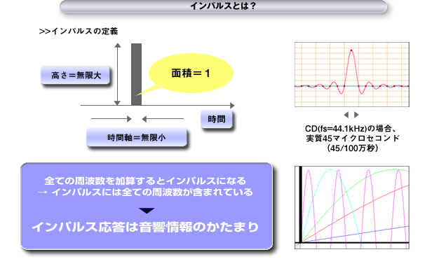 インパルスというのは、振幅が無限大で時間幅は無限小、つまり、立ち上がりと立ち下がりが究極的に速い信号のことだ。この究極に速い信号に正しく追従できるのなら、それは時間特性が優れているということになる。そしてインパルスには全ての周波数の振幅と位相が含まれているので、それを正しく再生できるなら、周波数特性という面から分析しても究極の忠実性を持つことになる。これがタイムドメイン理論の中心にある考え方だ。