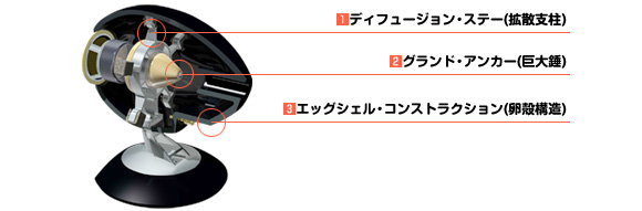 その理論を実際のスピーカーとして具現化するため、ECLIPSE TDシリーズでは、元の入力信号にない残響成分、スピーカー不要振動の徹底的な排除が行われている。ユニットを拡散支柱でマウントすることでエンクロージャーと機械的に分離する「ディフュージョン・ステー」、そのユニットの揺るぎない強固な足場となる重量級の鉄の塊「グランド・アンカー」、通常の箱形エンクロージャで起きるいわゆる箱鳴りが皆無の卵形エンクロージャー「エッグシェル・コンストラクション」といった設計は全て、不要振動排除のためのものだ。